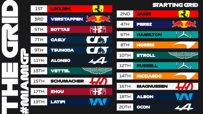 Los pilotos de Mercedes, los británicos George Russell y Lewis Hamilton, llegaron en el quinto y sexto puesto, respectivamente; mientras que el finlandés Valtteri Bottas se colocó en el séptimo puesto, el francés Esteban Ocon fue octavo. Finalmente, el tailandés Alexander Albon de Williams y Lance Stroll de Aston Martin, arribaron en la novena y décima posición para efecto de ser los últimos en sumar puntos en el Gran Premio debutante de Miami y la quinta carrera en el calendario.