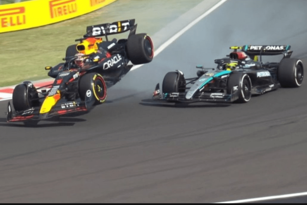 Max sufrió dos despistes en su afán de rebasar, tenía la intención de rebasar al piloto de Mercedes para tomar el lugar numero tres y poder subir al pódium, pero en la vuelta 63 se tocaron y el piloto de los países bajos se salió de la pista cayendo hasta el lugar número cinco por detrás del piloto de Ferrari Charles Leclerc.