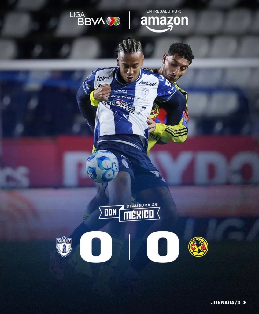 América empató 0-0 ante Pachuca correspondiente a la jornada 3 en el Estadio Hidalgo. Así que, las Águilas siguen sin conocer la victoria en el Clausura 2026, además suman 270 minutos sin poder hacer gol.