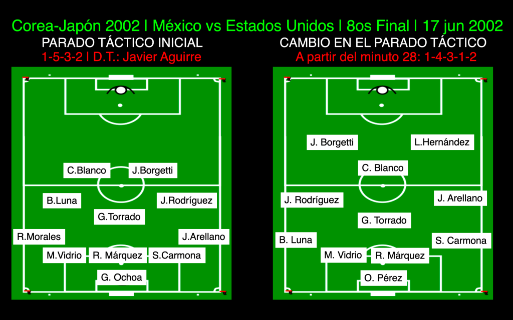 Las razones por las cuales perdió México aquella tarde en Jeonju, Corea del Sur y explicadas directamente por su técnico Javier Aguirre fueron dos: “Yo tengo línea de cinco todo el proceso y el mundial, elijo a los jugadores conforme a ésta línea de cinco en el fondo, jugábamos un 5-3-2, con dos puntas, uno era Cuauhtémoc y el otro Borgetti, tres volantes, buenos, de ida y vuelta, de recuperación, Torrado, Caballero, Aspe y con dos carrileros que eran dos extremos que eran Ramoncito Morales y el Cabrito Arellano; era muy bonito el equipo porque desdoblaba muy bien y estos cuates tenían siete pulmones, iban y venían… estábamos en ello cuando nos hace gol Estados Unidos, no estaba en mi guión ir perdiendo con los americanos, yo sabía que Bruce Arena se iba a echar atrás, iba alargar el partido, quería irse al tiempo extra, quería irse a los penales, esa era la opción de los americanos. Entonces yo estudiando y trabajando y tal. Mi error es que me hacen un gol torpe, una falta, mueven rápido, una distracción y gol. Yo, en lugar de mantener la calma, la ecuanimidad y seguir con mi plan de trabajo, me equivoco, no te diría que desoigo a Memo Vázquez, pero hago línea de cuatro, quito a Ramón y meto a Luis Hernández y descompongo lo que estaba bien, lo descompongo, me equivoqué dos veces, primero en el cambio, hombre por hombre y segundo en el sistema, no lo había trabajado caramba!”.