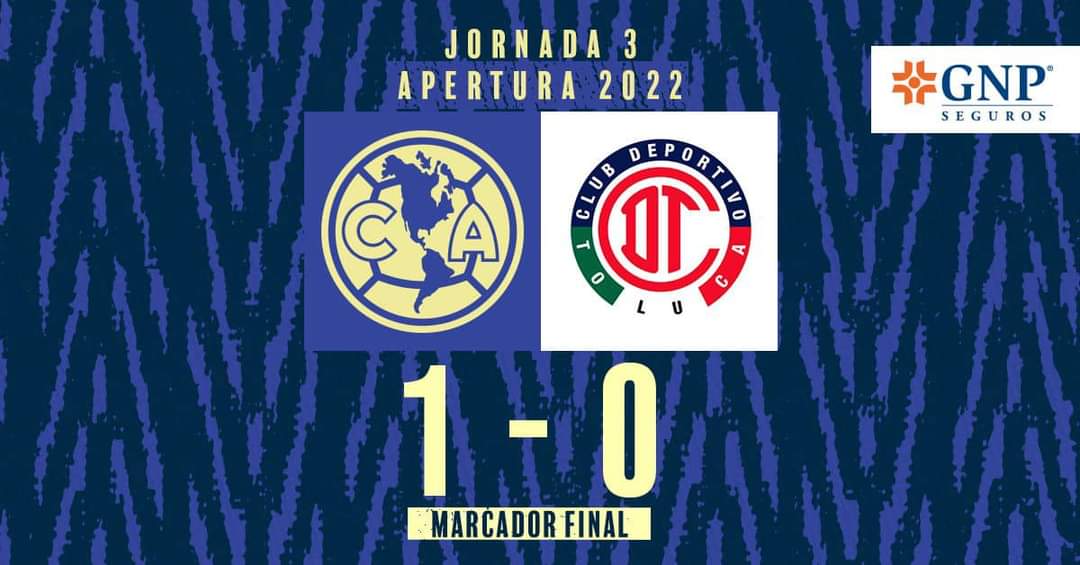 Las águilas del América obtiene su primera victoria del torneo al imponerse a los diablos rojos del toluca por la mínima diferencia con un golazo del guaraní Richar Sánchez desde afuera del área grande en un bombazo inalcanzable para el portero escarlata Santiago Volpi.