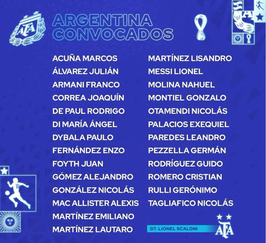 Emiliano “Dibu” Martínez, Gerónimo Rulli, Nahuel Molina, Gonzalo Montiel, Cristian “Cuti” Romero, Germán Pezzella, Lisandro Martínez, Juan Foyth, Rodrigo De Paul, Leandro Paredes, Alexis Mac Allister, Guido Rodríguez, Alejandro “Papu” Gómez, Enzo Fernández, Exequiel Palacios, Lautaro Martínez, Julián Álvarez, Nicolás González y Joaquín Correa,serán para poner nombres a los números, los primerizos en Oriente Medio.