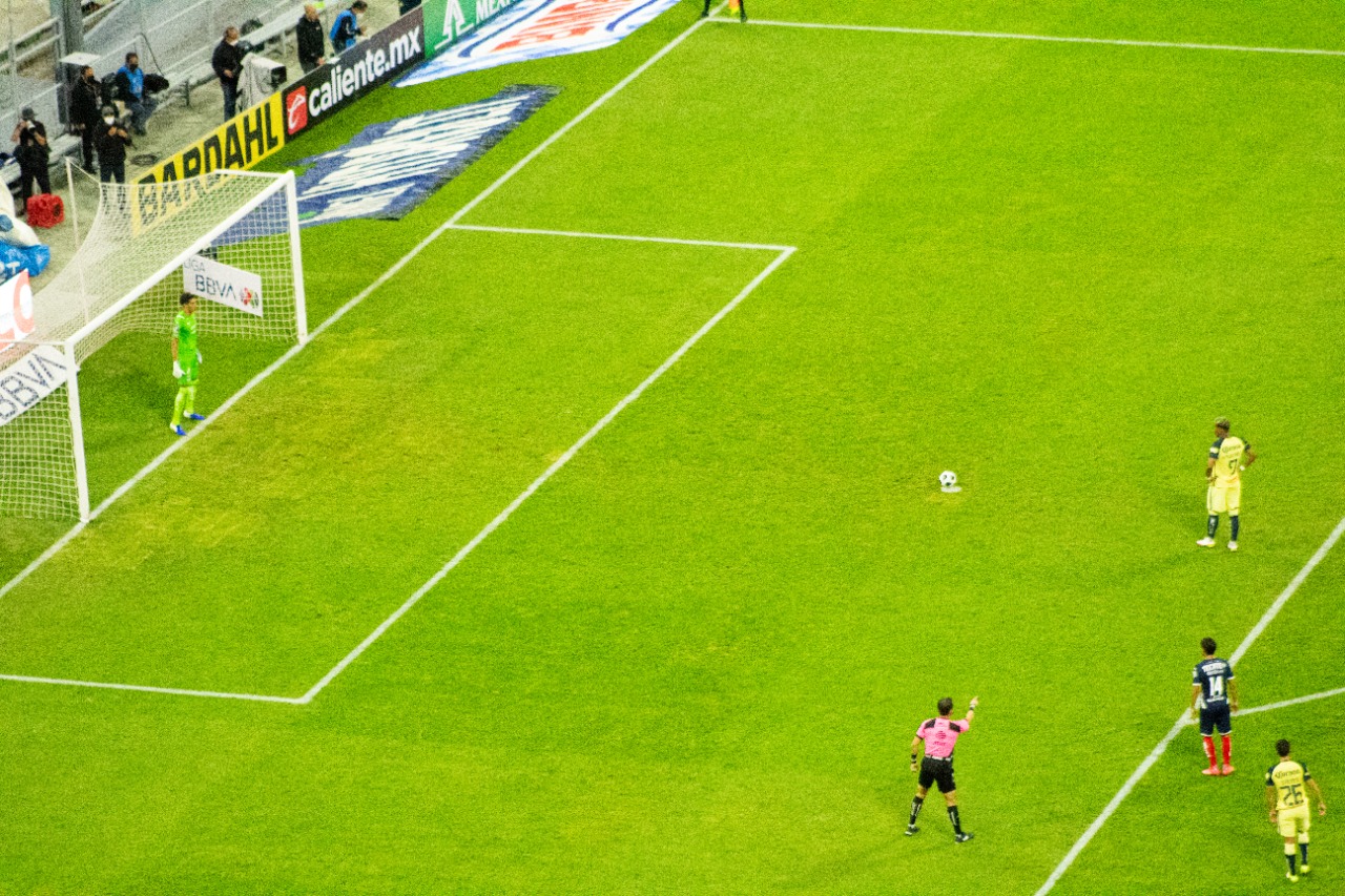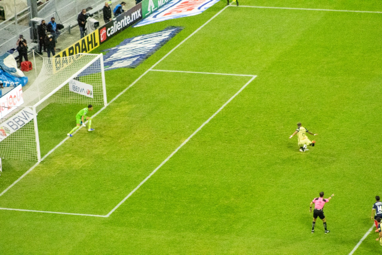 El segundo tiempo le comemtieron penal a S. Reyes donde se fue expulsado el central de monterrey, donde el que cobro fue Roger, después de perder mucho tiempo revisando la jugada Roger se resbala y le da doble toque al balón con lo cual se anulo. 🦅
