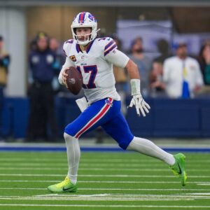 Josh Allen, primer quarterback en la historia de la NFL en marcar tres pases de touchdown y tres touchdowns por tierra. Foto: NFL México.