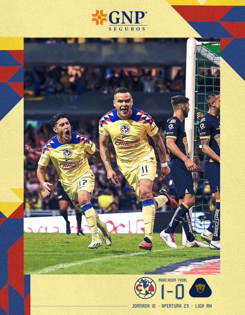 Jornada 10 Apertura 2023, América 1-0 Pumas, estadio azteca., gol de J. Rodríguez 76′.