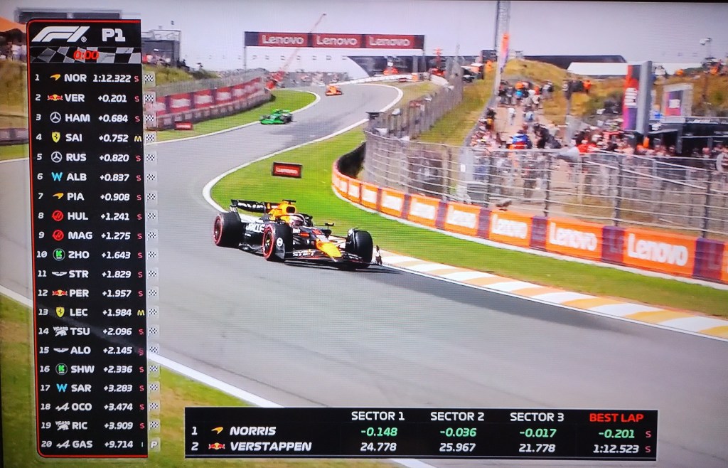 La P1 terminó con Lando Norris en primer lugar , segundo Max Verstappen y tercero Louis Hamilton , los McLaren desde el inicio marcando que son los mejores carros de la temporada.