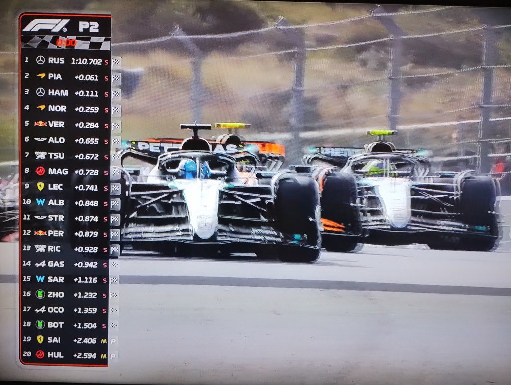 la P2 termina con: George Russell en primer lugar, Oscar Piastri en segundo y Louis Hamilton en tercero.
